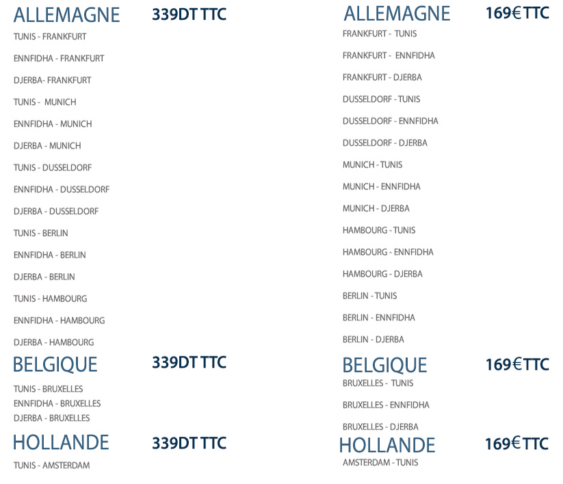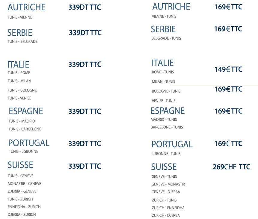 Ainsi entre 10 juin et 10 juillet 2015 achetez des billets d’avion à seulement 339 DT TTC aller-retour vers des destinations de l’Europe, Liban, Egypte et Maroc. La promotion est valable pour un minimum stay de 3 jours et un maximum stay de 15 jours. Plus d'informations sur le site www.tunisair.com